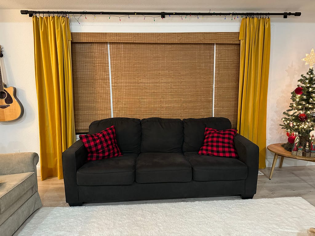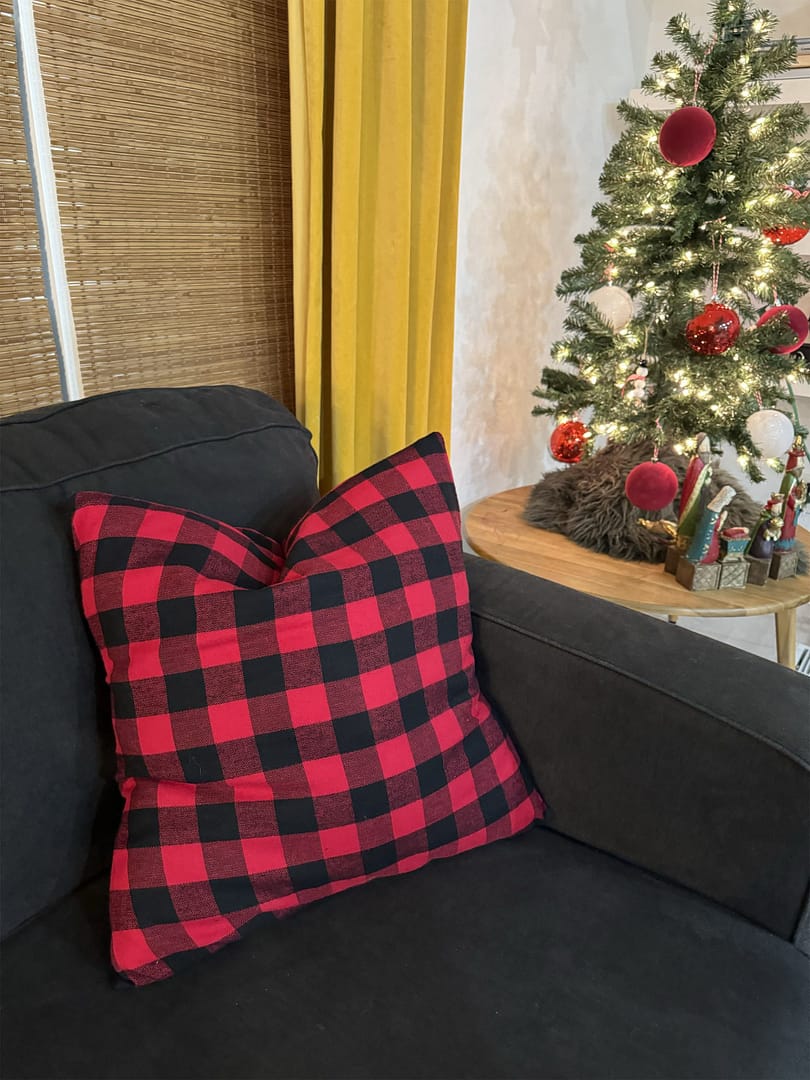 I wanted to update my beige living room pillows with this bright red checkered fabric. Not only were they comfortable to lounge on but they really brought my Christmas decorations together and made it look and feel so cozy.